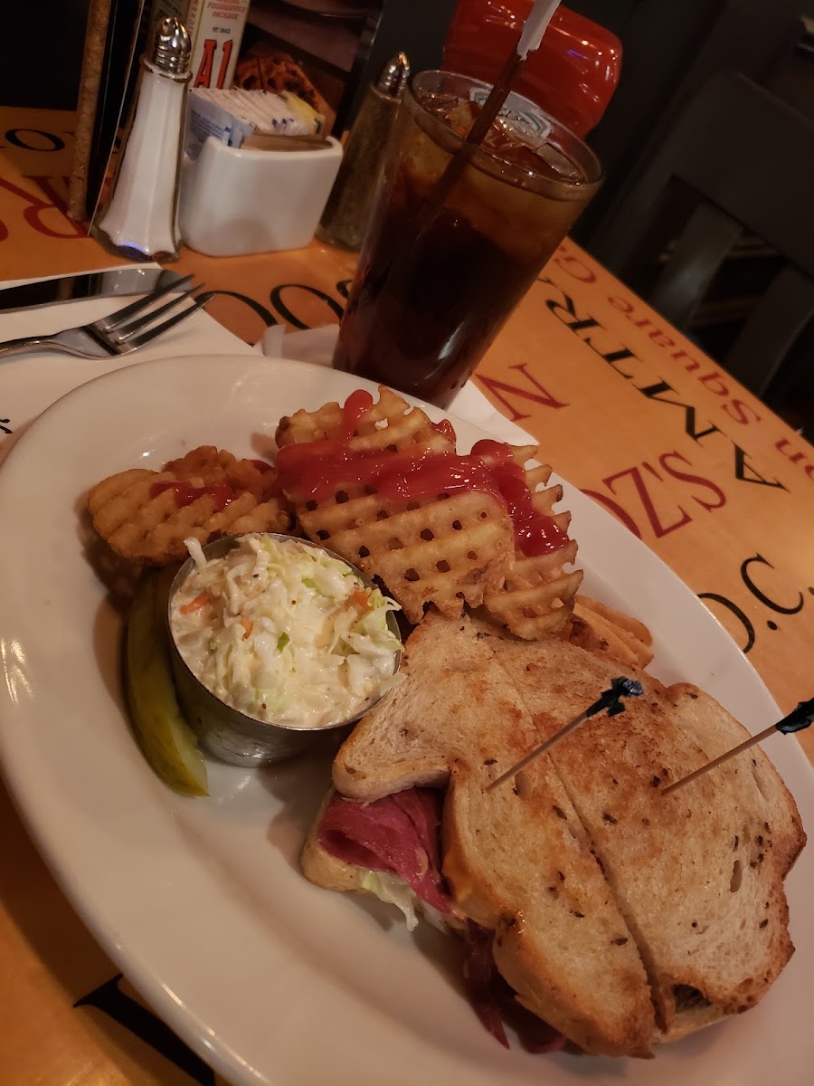 Ruben Corn Beef Sandwich Waffle Fries Coleslaw with a Coke